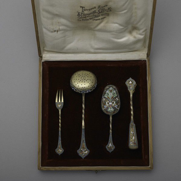 RUSSIAN ENAMELED GILT SILVER TEA ACCESSORIES