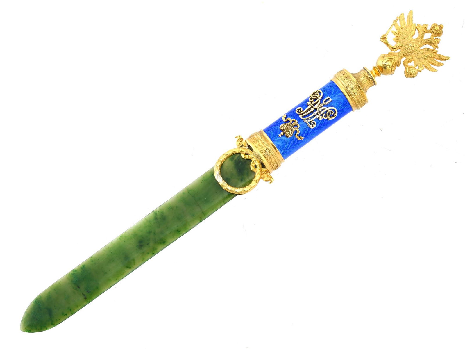 A Silver, Silver-Gilt and Hardstone Cabochon Mounted Nephrite Letter Opener3 days LeftA Diamond and Hardstone-Mounted Silver-Gilt and Guilloché Enamel Cigar Case3 days LeftRUSSIAN GILT SILVER GUILLOCHE ENAMEL LETTER OPENER9 hrs LeftRUSSIAN SILVER ENAMEL JADE GEMSTONE DOG LETTER OPENER9 hrs LeftRUSSIAN GILT SILVER ENAMEL GEMSTONE LETTER OPENER9 hrs LeftRUSSIAN SILVER ENAMEL RUBY JADE LETTER OPENER KNIFE9 hrs LeftRUSSIAN SILVER JADE ENAMEL LETTER OPENER WITH GEMSTONESFeb 07, 2026RUSSIAN SILVER ENAMEL LETTER OPENER WITH AMETHYSTFeb 07, 2026FABERGE STYLE SILVER GILT, ENAMEL AND NEPHRITE LETTER OPENER2 days LeftFABERGE STYLE SILVER GILT, ENAMEL AND NEPHRITE LETTER OPENER2 days LeftRUSSIAN GILT SILVER ENAMEL TORAH POINTER W GEMSTONEFeb 07, 202619th C. Faberge Style (31 grams) Russian Enamel Silver Dagger Letter Opener13 hrs LeftANTIQUE RUSSIAN SILVER PORCELAIN KNIFE, 1798Feb 07, 2026RUSSIAN SILVER PORCELAIN KNIFE, CATHERINA II, 1770Feb 07, 2026RUSSIAN SILVER PORCELAIN KNIFE, CATHERINA II, 1770Feb 07, 2026A JEWELED GOLD-MOUNTED ENAMEL PARASOL HANDLE CONVERTED INTO A PAPER KNIFE BY FABERGÉ,Feb 13, 2026
