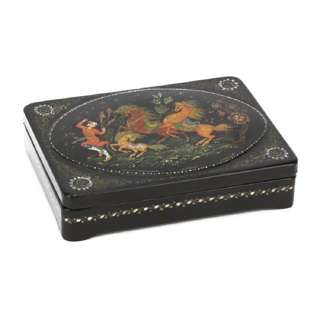 SoldFine Russian Signed Hand Painted Lacquer BoxFine Russian Signed Hand Painted Lacquer Box. Condition: Generally Good with Some Glaze Cracks.Dimension: Box- 7.5" x 5" x 1.4". Provenance: From a Long Island, NY Home. Please note the absence of a cSee Sold Price