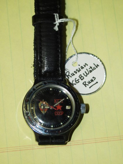 SoldRUSSIAN KGB MILITARY WATERPROOF DIVERS WRISTWATCHRussian KGB Military Men's Diver's Wristwatch. Silver Chrome Steel Case & Polished Dial with Sword and Shield Insignia. Glow in the dark Hands with Date and Rotating outer bezel marker. 200 meter wateSee Sold Price
