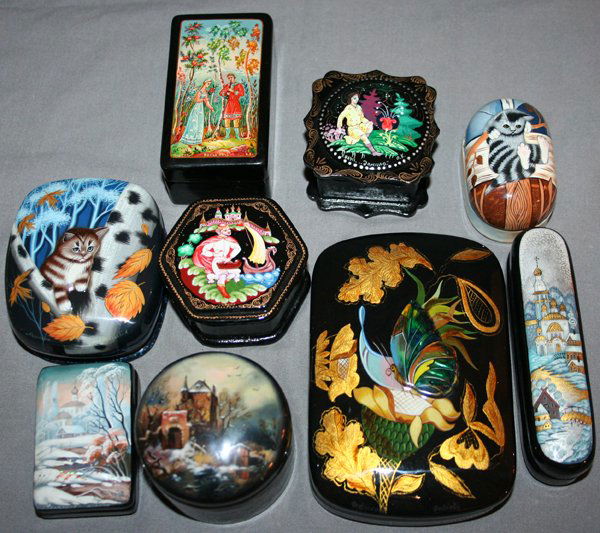 RUSSIAN LACQUER BOXES, NINE, H 1", W 1"-3"