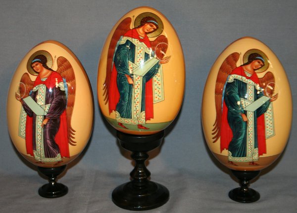 RUSSIAN LACQUER EGGS DEPICTING ANGLES, 3, H 6"