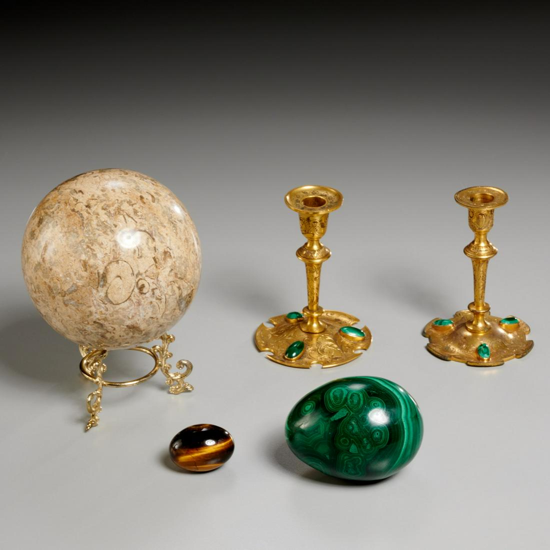 Russian malachite mounted candlesticks & specimens