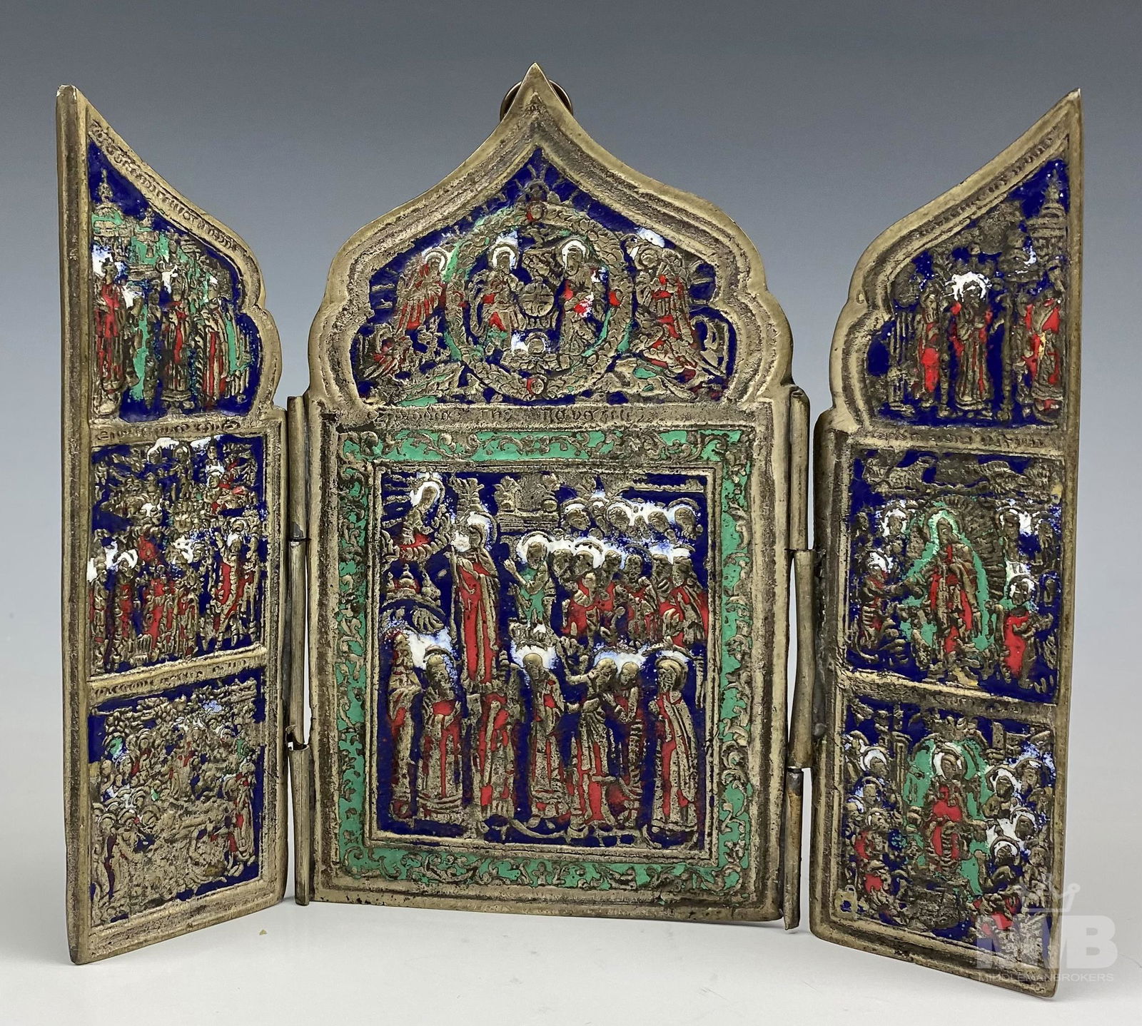 EUROPEAN LEATHER AND GILT BRONZE DIMINUTIVE FRAMES, LOT OF FIVEMar 06, 2026A composed lot of three tempera on wood Russian icons with silver and silver plated oklad.2 days LeftLot of 3 icons. Russia. Late 19th century. One of the presentation of Christ; Scenes of the life ofMar 01, 2026A TURQUOISE INLAID BRONZE AND SILVER 'FISH' TINDER POUCH, CHUCKMUCK, 19TH CENTURYMar 11, 2026GREEK RUSSIAN ORTHODOX CHURCH GOSPEL GILT BRASS COVERS folioA GROUP OF THREE INLAID PARCEL-GILT SILVER TINDER POUCHES, CHUCKMUCK, 19TH CENTURYMar 11, 2026A HEAVY SILVER AND COPPER REPOUSSÉ PORTABLE SHRINE WITH A BRONZE TSA-TSA, GAUMar 11, 2026A FINE SILVER AND COPPER GAU WITH THE EIGHT BUDDHIST EMBLEMS AND A TERRACOTTA TSA-TSA, 19TH CENTURYMar 11, 2026Russian Traveling Icon Panels with Christ Pantocrator5 days Left19h CENTURY RUSSIAN ORTHODOX BRONZE ICON TRIPTYCH antique DEISISCollection of Vintage Florentine Devotional Home AccentsMar 08, 2026Russian Icons, 19th C., 3May 07, 202619h CENTURY RUSSIAN ORTHODOX BRONZE ICON TRIPTYCH antique MOTHER OF GODRussian Orthodox Enamelled Bronze Travel Icon with the Old Testament TrinityMar 06, 2026Three Renaissance Style Enameled Lead Glass Panels5 days LeftPair of Antique Chinese Folding Screens6 days Left