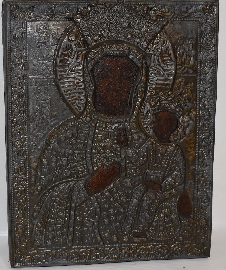 RUSSIAN ORTHODOX ICON W/REPOUSSE DECORATED FRAME
