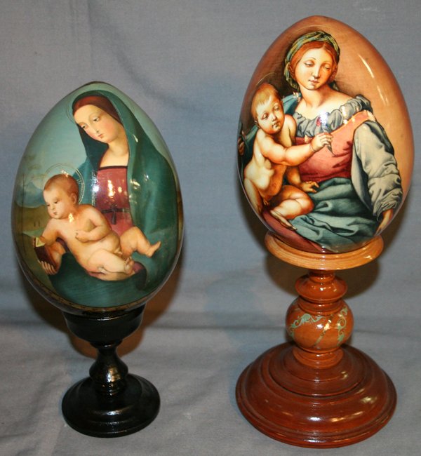 RUSSIAN RELIGIOUS THEMED LACQUER EGGS, 2, H 6"