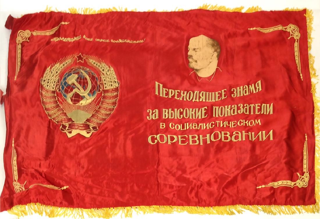 SoldRare Early Soviet Large Flag Banner with Socialism Propaganda Painted on Silk. Russian Civil War eraRare Early Soviet Large Flag Banner with Socialism Propaganda Painted on Silk. Russian Civil War era 1917-1922. Purchased by Owner in Russia in the 1970s. Size : 76 1/2" x 56". ~ . Detailed conditionSee Sold Price