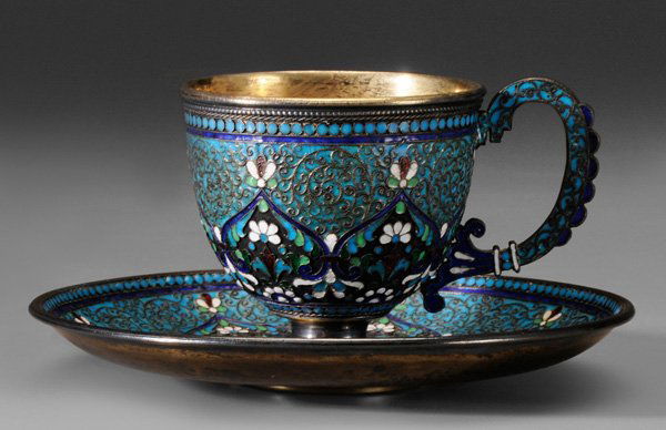 SoldA RUSSIAN SILVER CLOISONNE ENAMEL CUP & SAUCER SETA Russian enameled and silver set of a cup and a saucer. The exteriors are enameled with floral and geometrical patterns in green, cobalt blue, red, and light blue shades made in the Cloisonne techniqSee Sold Price