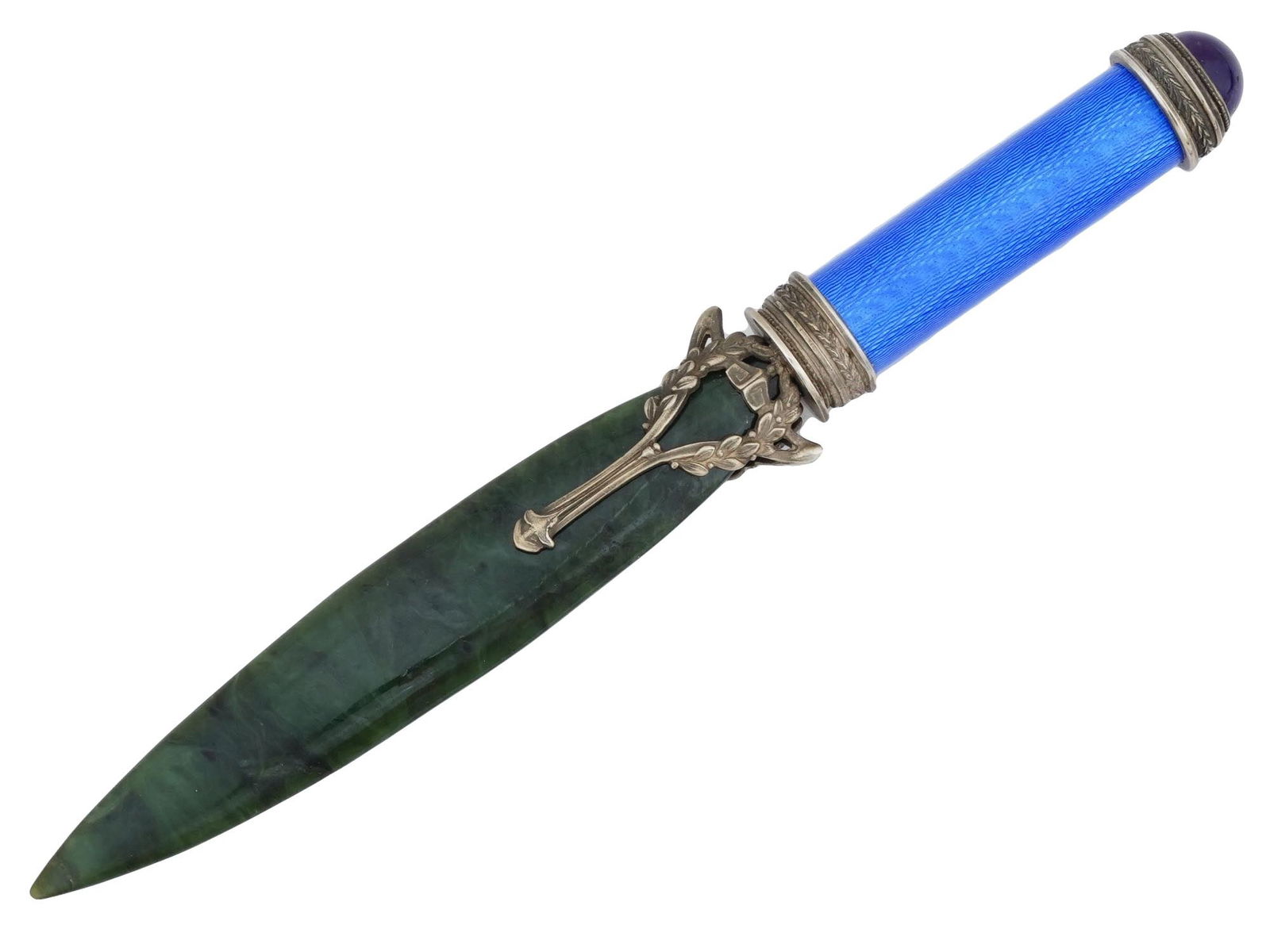 SoldRUSSIAN SILVER ENAMEL JADE LETTER OPENER W DIAMONDSA Russian gilt silver and enamel letter opener knife. The letter opener is made of a hand carved nephrite jade blade decorated with laurel wreaths and ribbons on the ricasso on both sides. The handleSee Sold Price