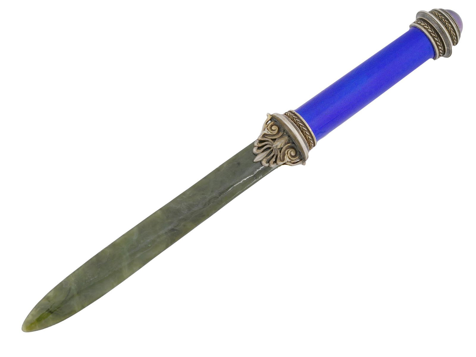 RUSSIAN SILVER ENAMEL NEPHRITE JADE LETTER OPENER