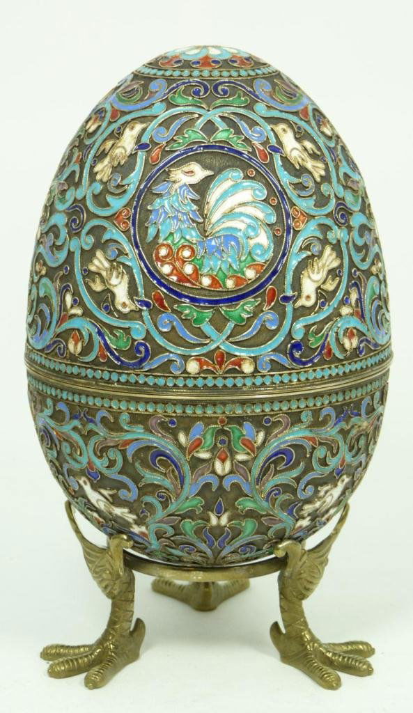 RUSSIAN SILVER ENAMELED EGG BOX w STAND