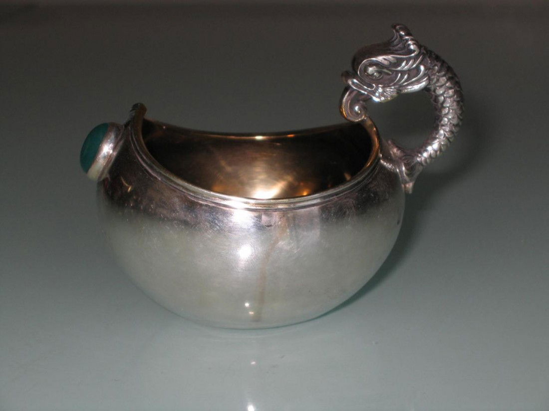 RUSSIAN SILVER KOVSH WITH GREEN CABOCHON STONE
