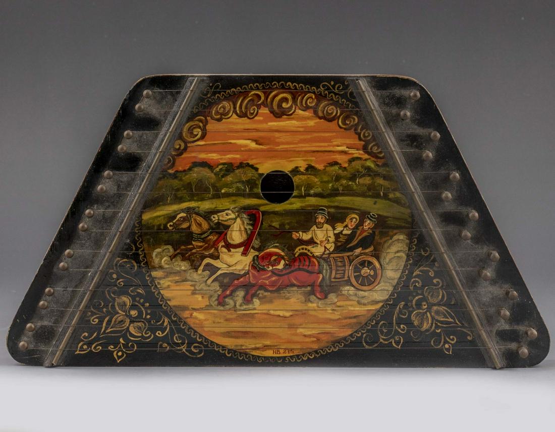 A wooden lacquerware zither decorated with gold-painted scenes of a Tang Dynasty palace banquet.CJ Auction$60010 hrs Left