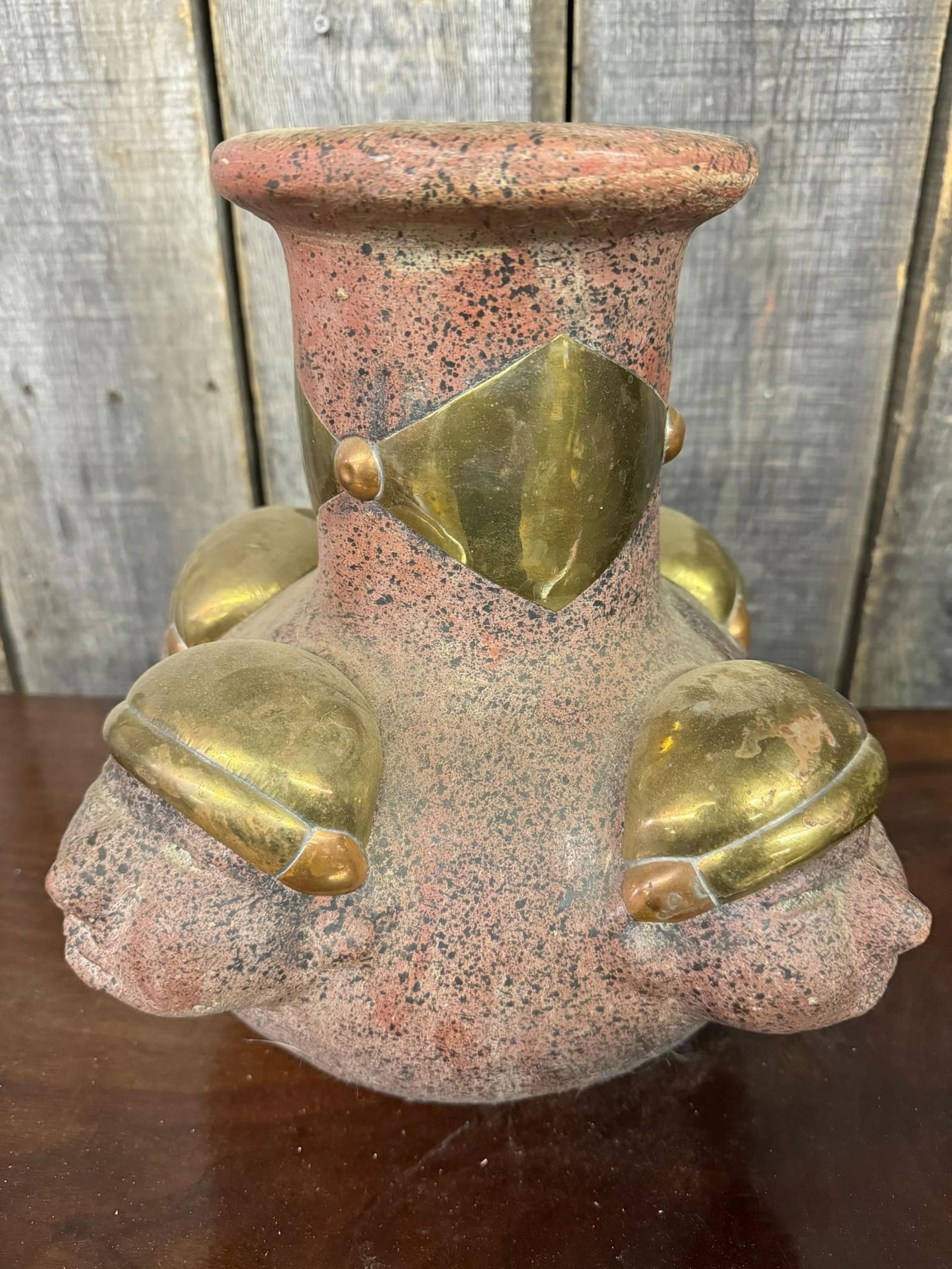 Rustic Terracotta Ware Vase with Faces Brass Style and Copper