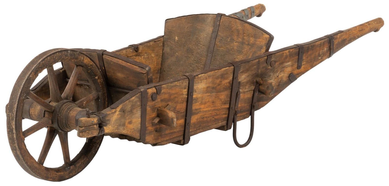 SoldRUSTIC FRENCH PROVINCIAL POPLAR WHEELBARROWFrench Provincial poplar wheelbarrow, late 19th c., two handles, central wheel, approx 26.5"h, 73"w, 32.25"d Start Price: $100.00See Sold Price