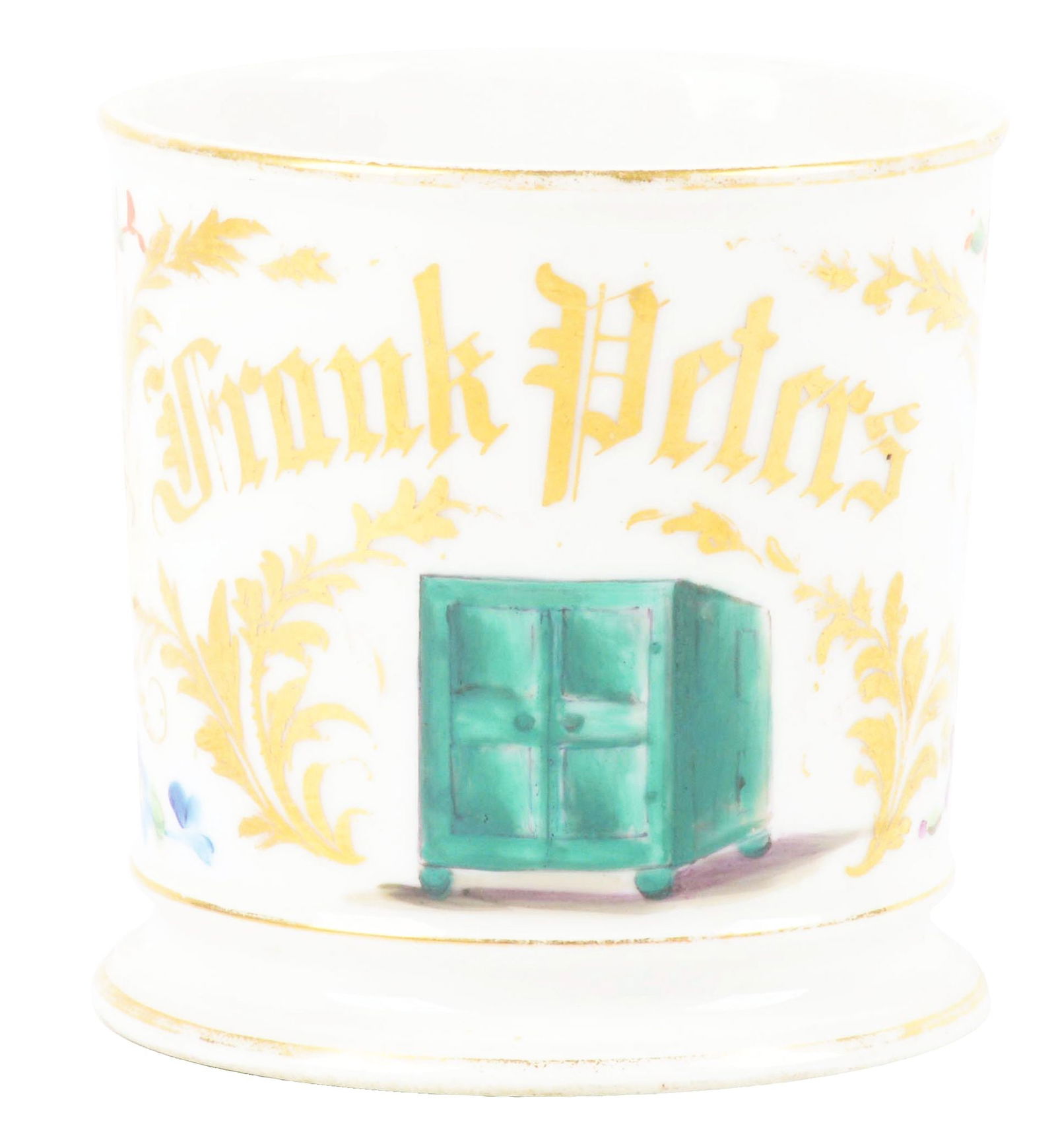 SoldSAFE MAKER SHAVING MUGFrank Peters in gold gilt. Nice image of green safe on front, with floral wrap on both sides. Condition: (Excellent+). Dimensions: 4 - 1/2" x 3 - 1/2" x 3 - 1/2".See Sold Price