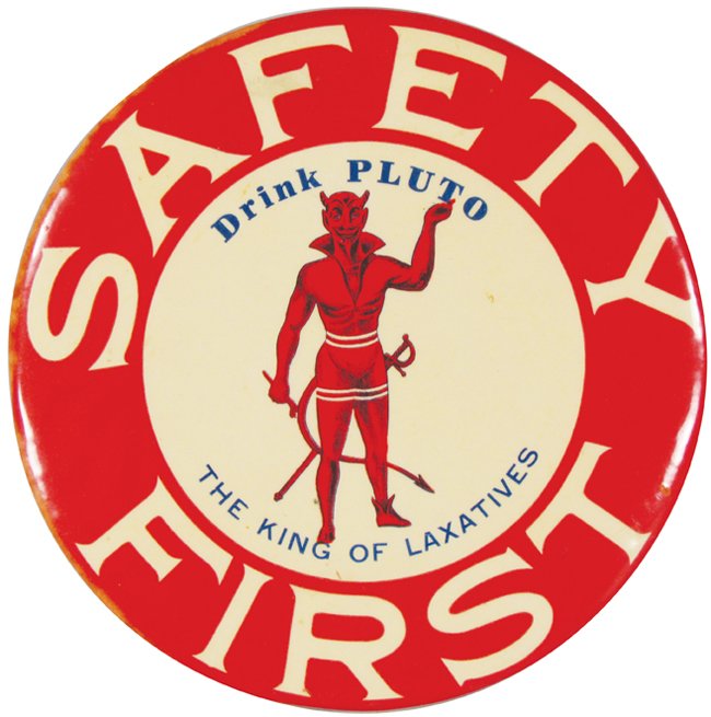 Safety First, Pluto Laxative Celluloid Button Sign