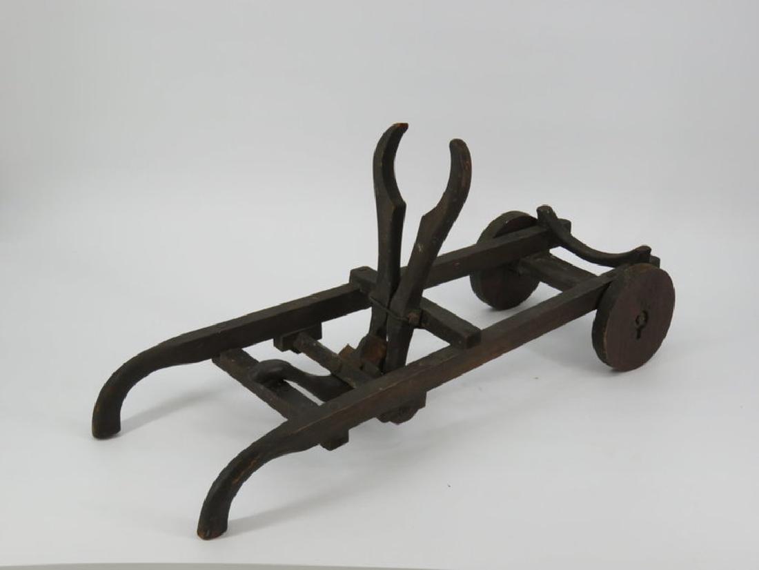 SoldSALESMAN SAMPLE 1890 Barrels Moving Hand Cart Dolly In Oakwood, Iron & CopperA late 19th century salesman sample of a hand moving cart truck.This is a miniature scale model of a hand moving cart truck created as a sample in the late 19th century. This antique model is a miniatSee Sold Price
