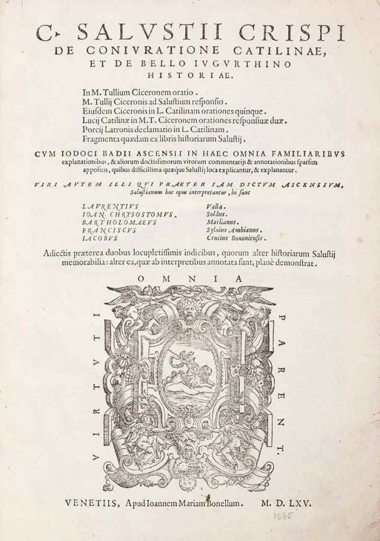 Sold[Aldina][Aldina]. Lotto composto da 3 edizioni aldine, con tra l’altro Coniuratio Catilinae et Bellum Iugurthinum di Gaio Sallustio Crispo del 1567. (3 volumi) 250 Sessione lotti 331 - 678See Sold Price