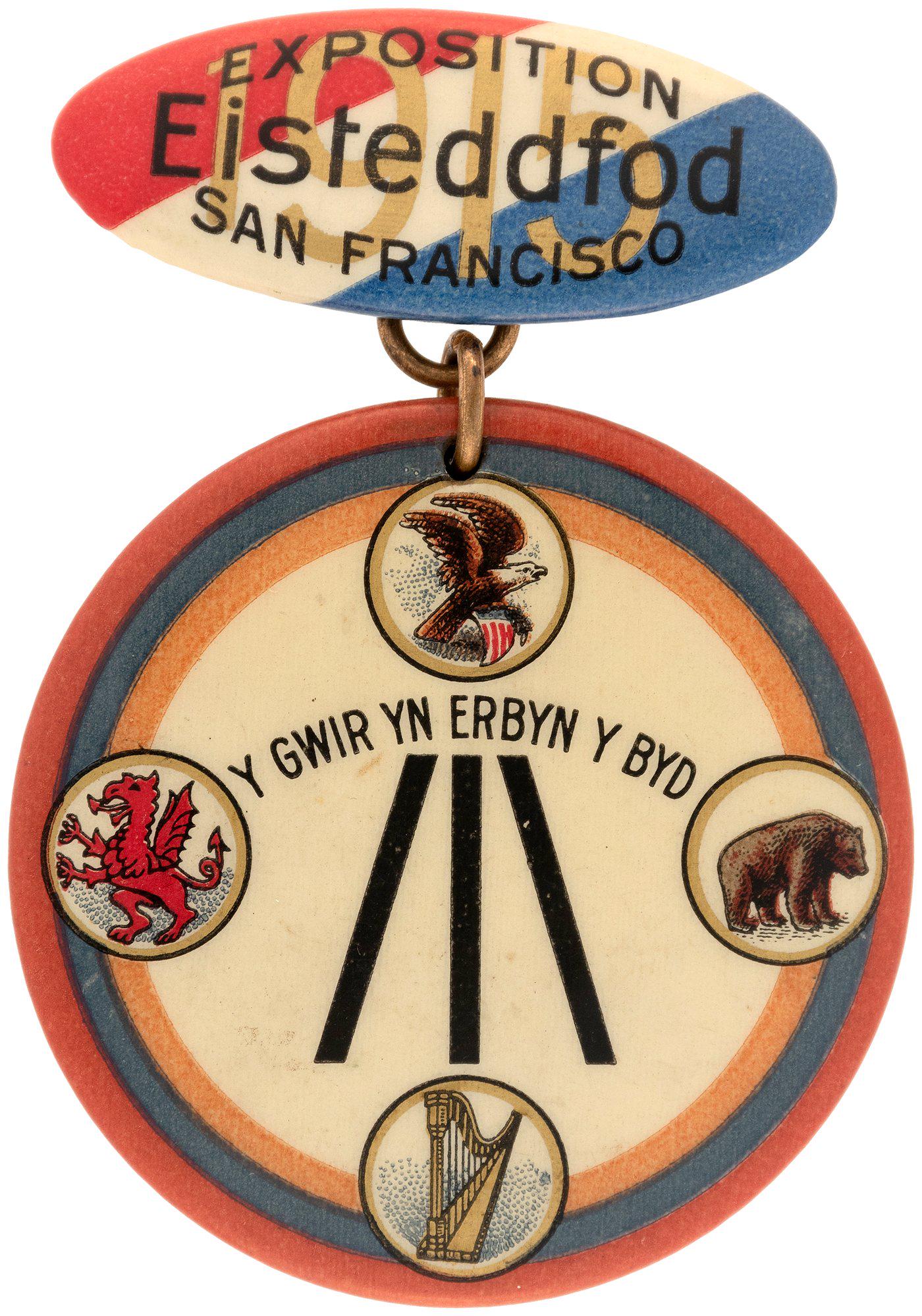 SAN FRANCISCO EXPOSITION 1915 BUTTON WITH WELSH TEXT
