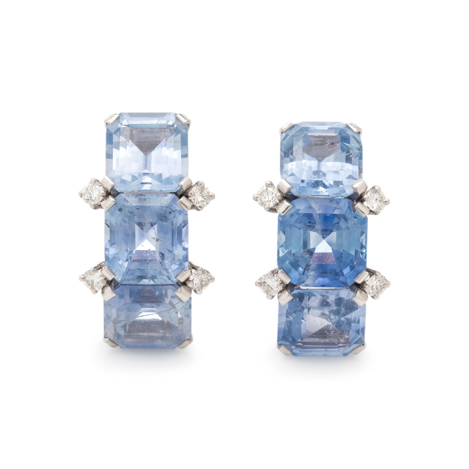 SoldA Pair of Sapphire & Diamond Earclips.A Pair of Sapphire & Diamond Earclips. 14 karat white gold earclip mountings each contain three round sapphires surrounded by 26 round diamonds. Diamonds total approximately .50 carat 5/8" x 3/8" Wt:See Sold Price
