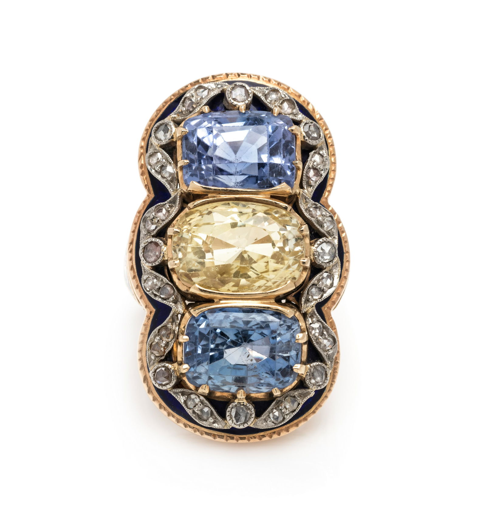 SAPPHIRE, DIAMOND AND ENAMEL RING