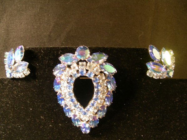 Vintage B David Light Blue and Clear Rhinestone Silver Tone Brooch Pin and Screw Back Earrings SetGolden Age Jewelry Auctions4.5(57)$64 days Left