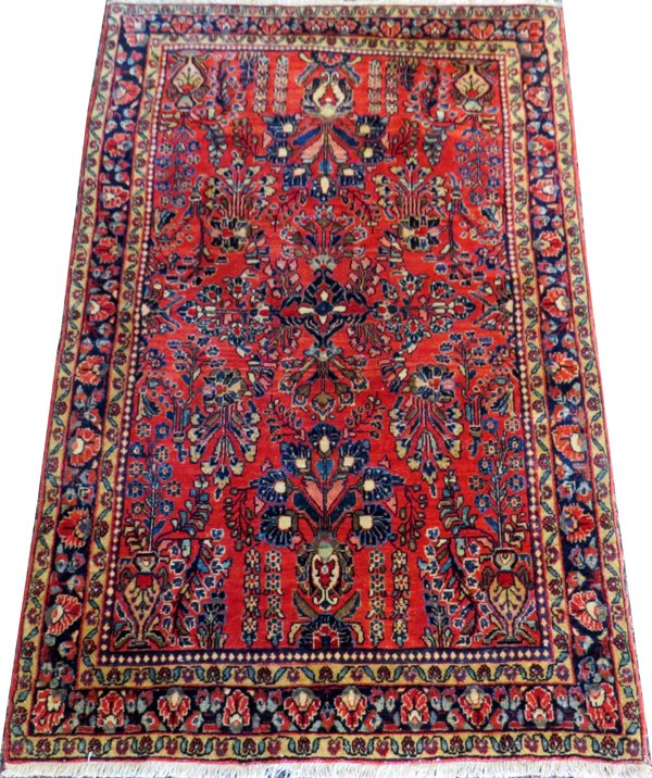 SoldPERSIAN LILLAHAN ORIENTAL RUG C 1940PERSIAN LILLAHAN ORIENTAL RUG C 1940 W 3'2" L 4'9" :Deep blue border. Red field.See Sold Price