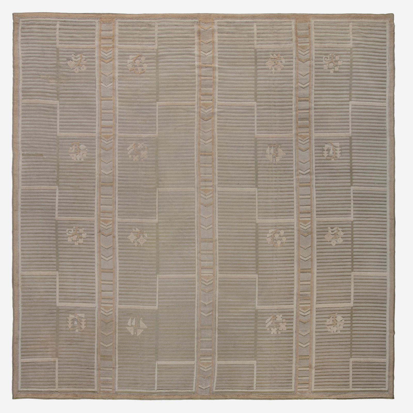 SoldSigvard Bernadotte, Half-pile carpetSigvard Bernadotte Half-pile carpet Nils NessimSweden, c. 1955hand-woven wool, hand-knotted wool 109 w x 147 l in (277 x 373 cm) Woven signature to edge 'SB'. Fabric manufacturer's labelSee Sold Price