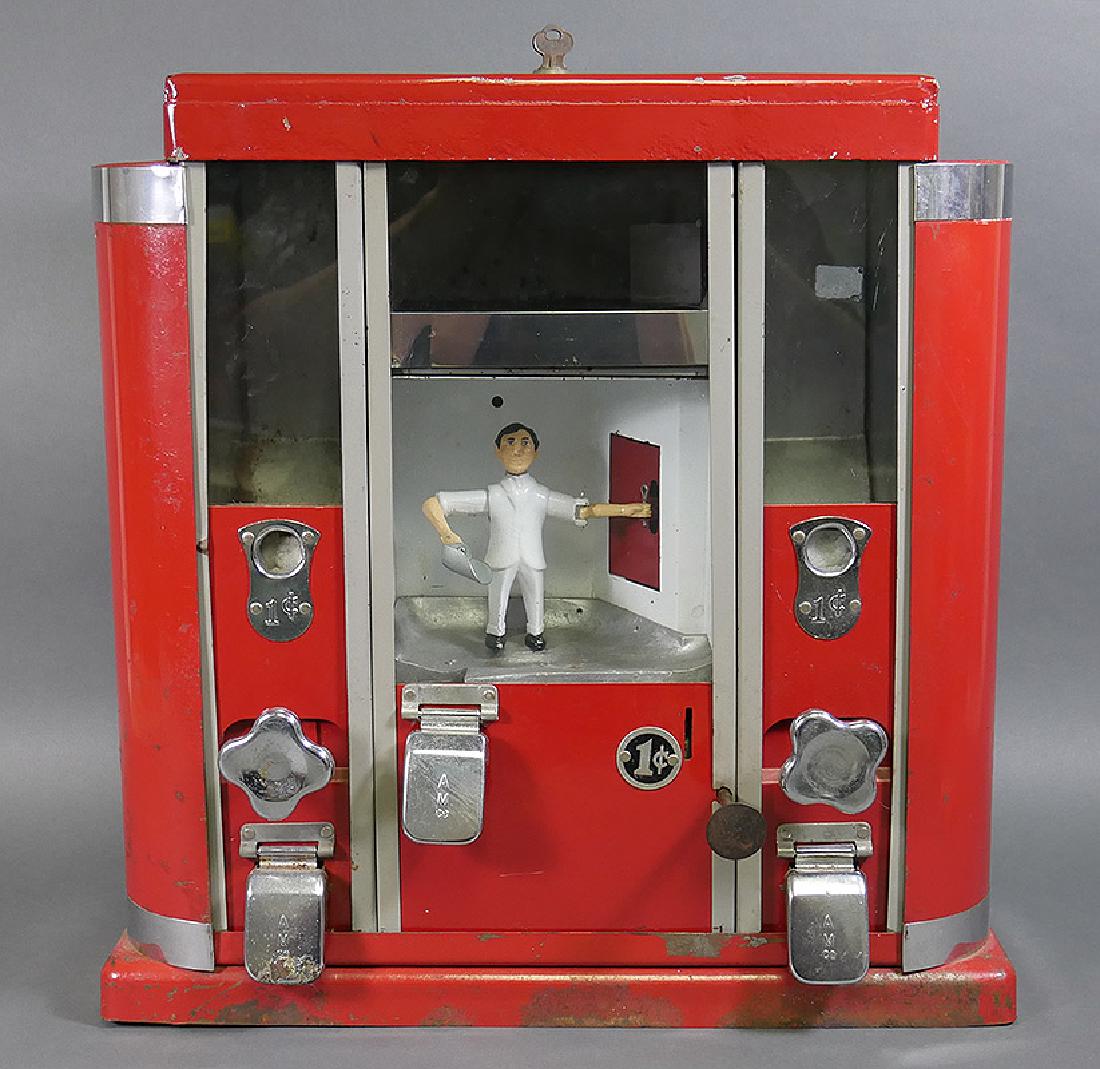 Advance Model D 1-cent gumball machineMar 28, 2026Delicious Goodies 1-cent candy vendorMar 28, 2026Vintage Coca-Cola Vendo 83 Pop Bottles Soda MachineC.J. Sheils Personal Stereophonic Music Wallbox WurlitzerMar 21, 2026U Select It Coin 25 Cent Operated Cigarette Machine RestoredMar 21, 2026Jennings The Governor 5 Cent Slot Machine6 days LeftMill's Novelty Co. High Top Slot Machine4 days LeftMills 1940s Black Cherry Nickel Slot MachineMar 14, 2026Art Deco Coin Operated Cigarette Vendor2 days LeftPULVER CHEWING GUM ONE-CENT WALL-HANGING PORCELAIN VENDING MACHINE FEATURING THE YELLOW KIDMar 05, 2026YELLOW KID PULVER GUM DISPENSER MACHINE2 days LeftDrink Coca Cola Vendorlator VMC Model 27 Vending MachineMar 21, 2026Little Duke 5-cent slot machineMar 28, 2026Mid 1950s Seeburg 160 Wall-O-Matic Remote Jukebox Song SelectorMar 22, 2026Ballys Vintage Slot Machine1 day Left25 Cent Mills 777 Restored Slot MachineMar 21, 2026