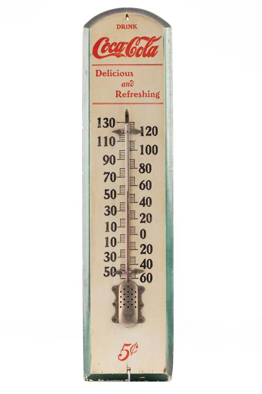 Scarce vintage wooden Coca-Cola Advertising Thermometer, 21" L x 5" W, marked "T.B. Thermometer Co.,