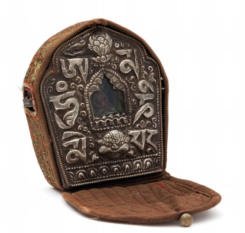 Scatola buddista da viaggio in rame e argento