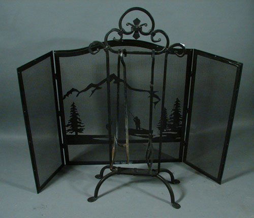 Scenic Sporting Fireplace Screen & Iron Tools wit