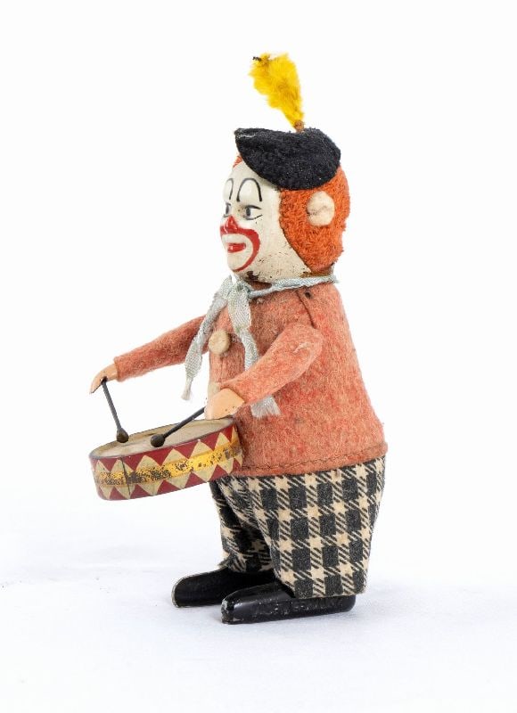 SoldSchuco Solisto Clown with Drum No. 986/1 DancingSchuco Solisto Clown with Drum No. 986/1 Dancing Figure, c. 1952 Made in U.S.-Zone Germany. Tin body, wool-felt clothes, lithographed tin drum, height 4 ½ in., clockwork (functions). The clown danceSee Sold Price