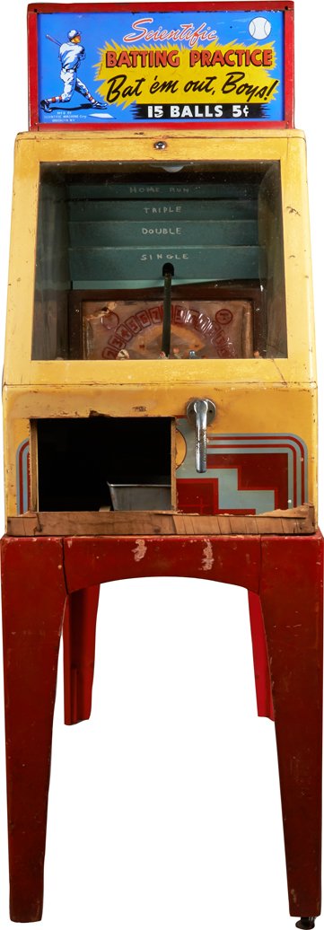 Sold5¢ SCIENTIFIC MACHINE CORP. PITCH' EM & BAT' EM BASEBALL ARCADE MACHINE.C. 1948, Scientific Machine Corp. The large wood cabinet is painted in an amber color with baseball decals stenciled throughout. The playfield is clean with seven 3-Dimensional players and five scoreSee Sold Price