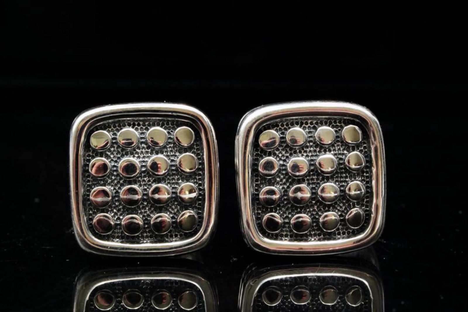 SoldJOHN HARDY 18K GOLD STERLING SILVER SQUARE DOT EARRINGSJOHN HARDY 18K GOLD AND STERLING SILVER EARRINGS Earrings measure 0.55" H x 0.55" W 18K yellow gold and sterling silver square earrings Pre-owned in excellent condition, please refer to pics OriginaSee Sold Price