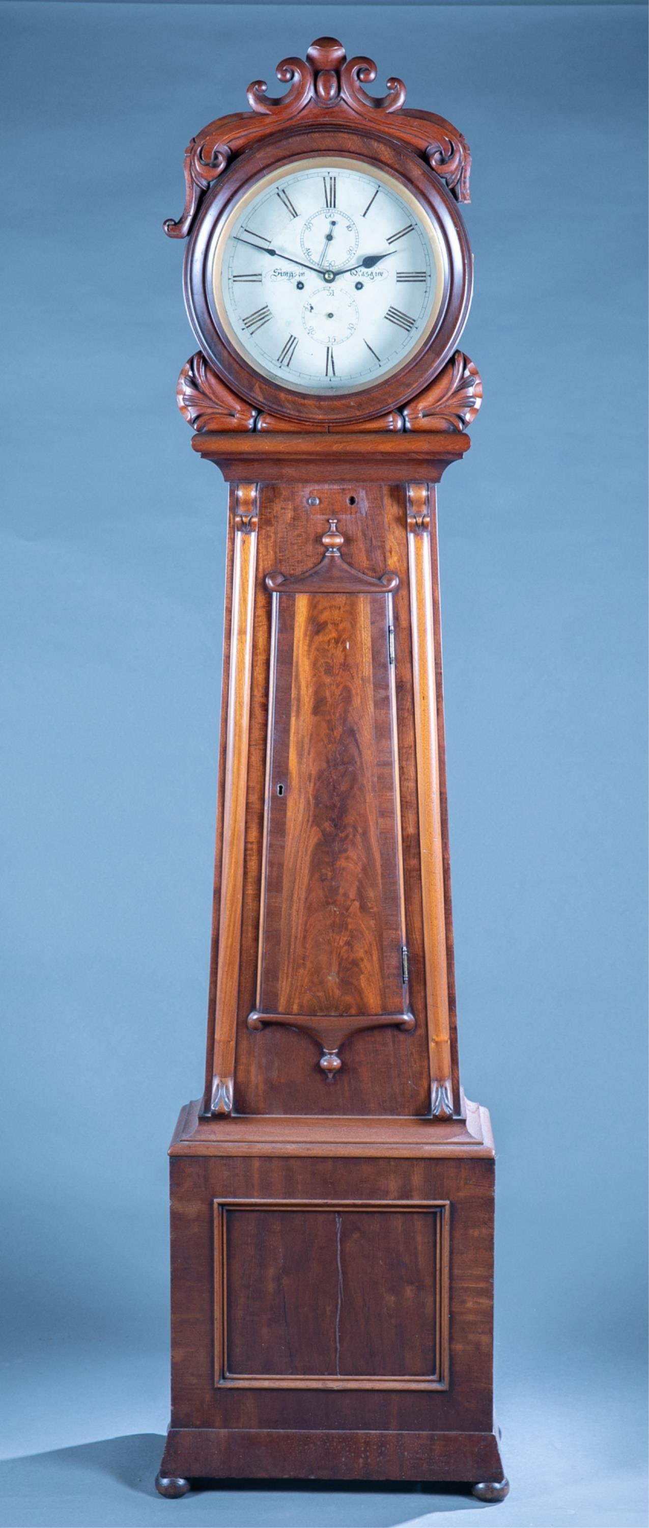 Scottish barrel head mahogany tall case clock.