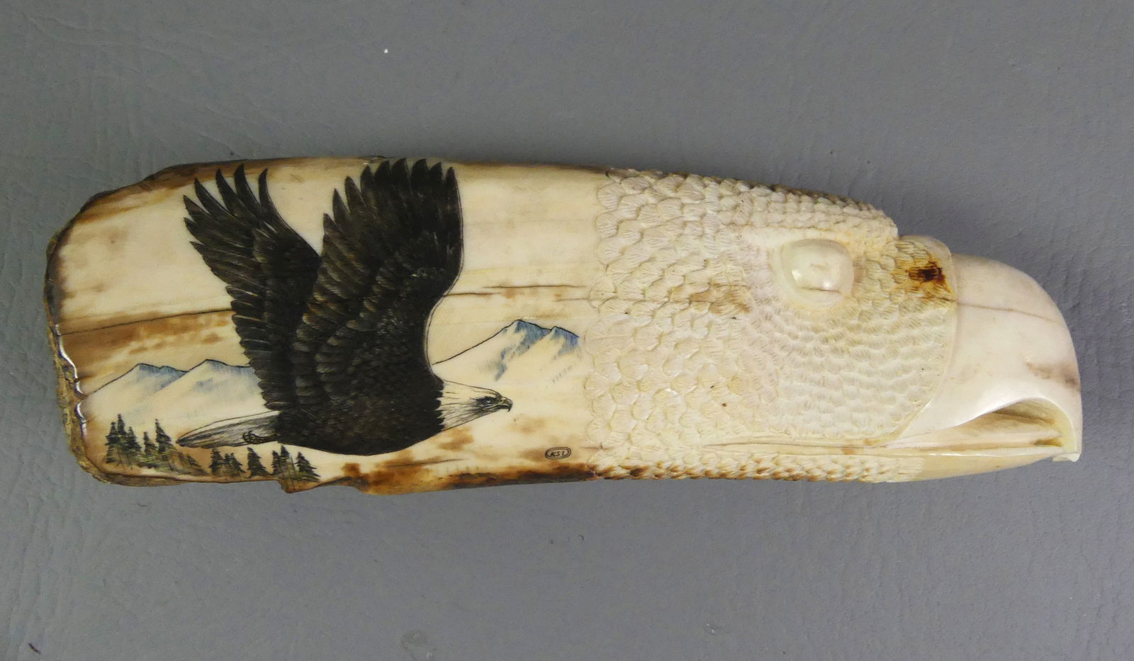 POLYCHROME SCRIMSHAW WHALE'S TOOTH WITH AMERICANA MOTIFS 19th Century Length 5.5".Eldred's4.8(484)$5007 days Left