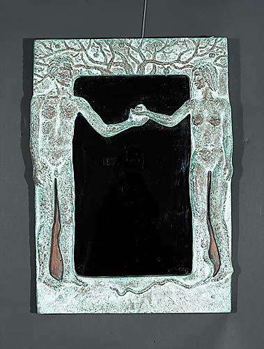 SoldERTE 'SUN & MOON' BRONZE FIGURAL HAND MIRRORRomain de Tirtoff, Erte (Russian / French 1892-1990), 'Sun & Moon', 1985, limited edition bronze hand mirror, featuring an embracing couple en verso, with etched signature en verso and etched date, RKSee Sold Price