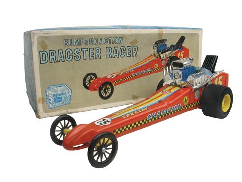 SoldMURRY SEARS DRAGSTER PEDAL CARAll original Murry Pedal Car. Has great colors and Hot Rod look. Has exhaust coming out side of hood. One side is loose but present. Missing 1 fender marker. A great looking toy! 35" ExcellentSee Sold Price