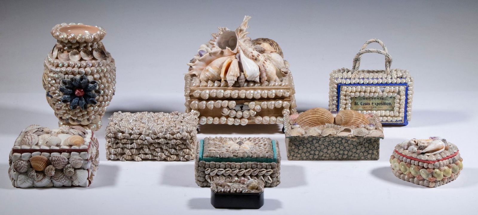 SEASHELL ENCRUSTED BOXES & VASE