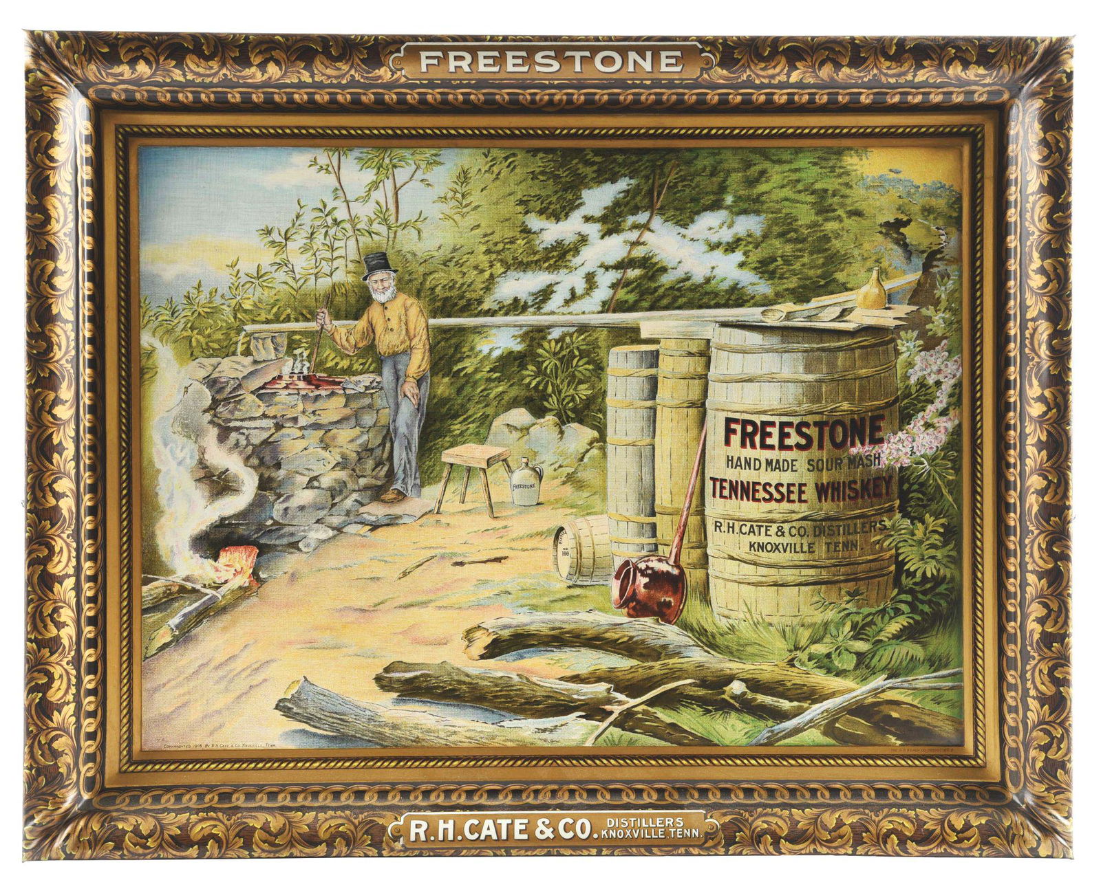 SELF FRAMED TIN PAINTED FREESTONE TENNESSEE WHISKEY SIGN.
