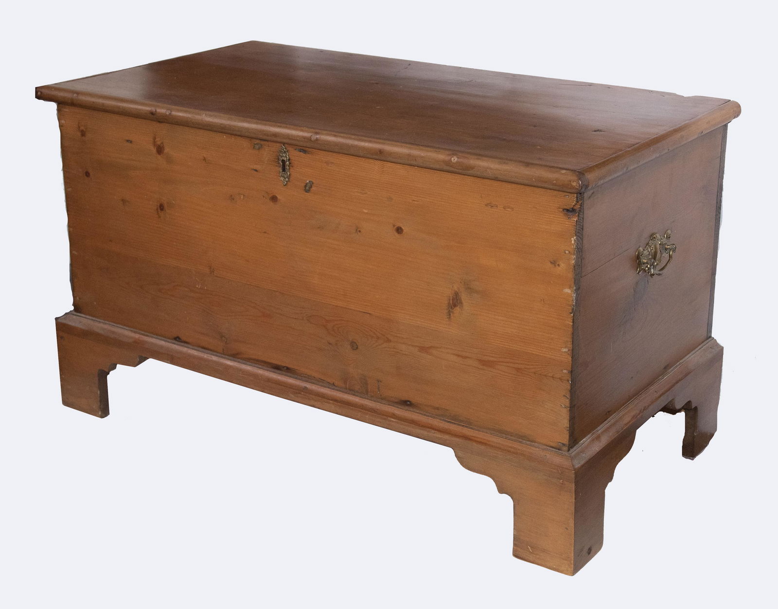SoldANTIQUE AMERICAN PINE STORAGE TRUNKAmerican pine storage trunk, late 19th/ early 20th c., visible dovetail construction, hinged top, open interior, bracket base, lacking interior lock, (one) bail handle, approx 17.25"h, 32.5"w, 17.75"dSee Sold Price