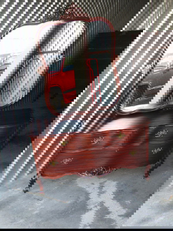 Soldornately carved 3 pc. Universal Furn., bedroom set13 drawer serpentine dresser with mirror, full or queen size headboard and footboard with wooden rails and a 4 drawer side chest with marble top(cracked and piece missing) originally cost over $5000.0See Sold Price