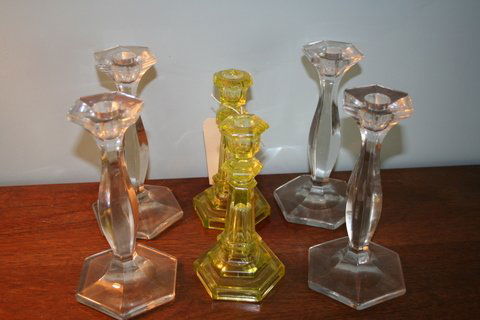 SET 4 CLEAR GLASS CANDLESTICKS H.9" PLUS PR. VASE