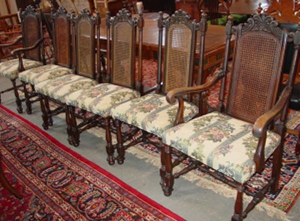 SoldSet of (6) Jacobean Cane Back ChairsSet of (6) Jacobean chairs with rope turning and carving. England C. 1670-1700, cane in good shape, one seat repaired at back, (2) 17th Century, (2) early 19th Century, (2) late 19th Century. 18" seatSee Sold Price