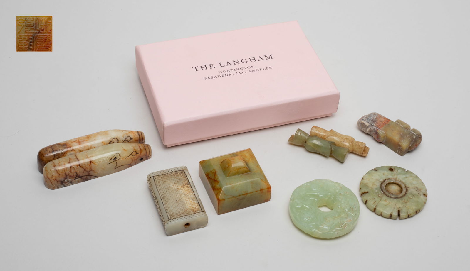 SoldSet Chinese Jade Stone Agate CarvingsIncluding three Chinese jade stone carvings, carved as a seal, an archaic beast, or with archaic motifs, and two agate beads. 6.5*1.3inch.See Sold Price
