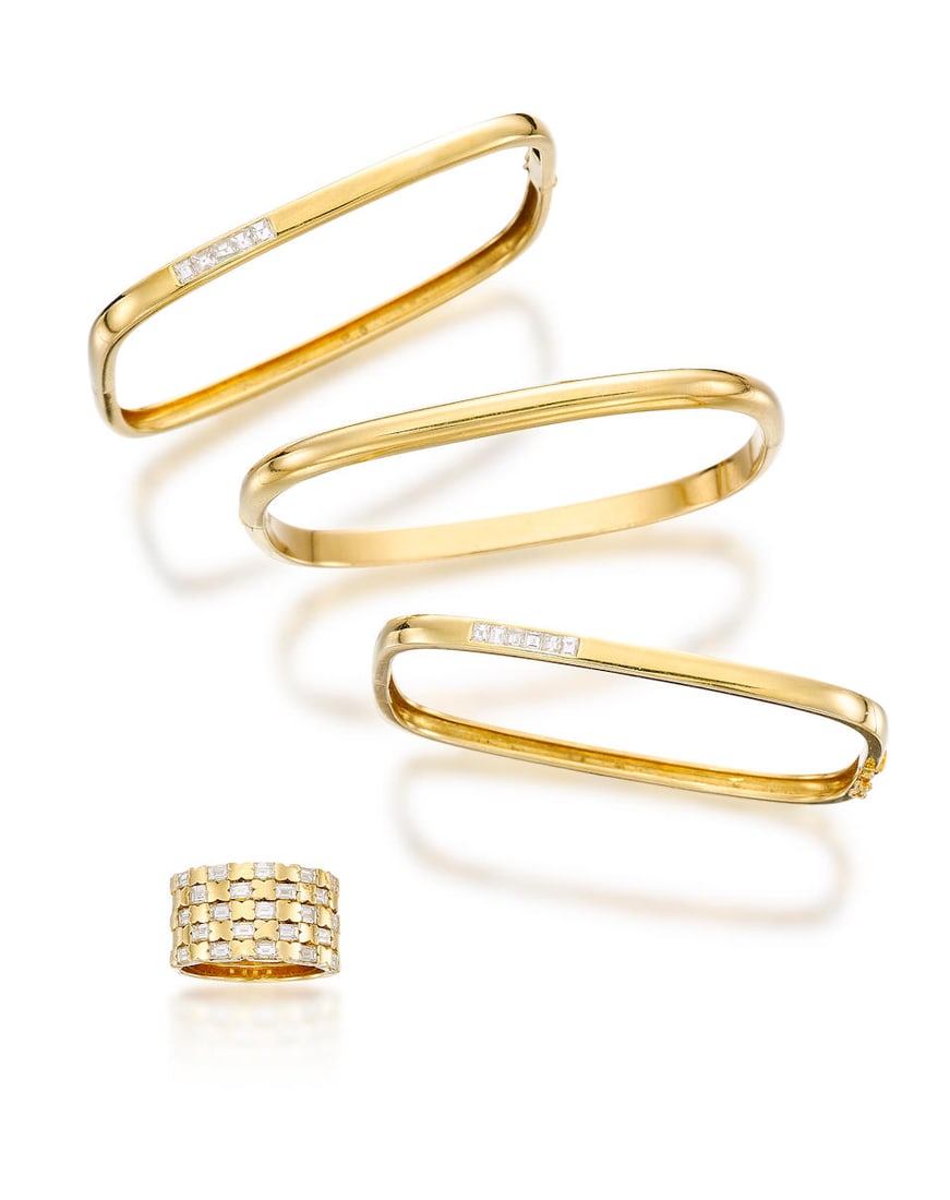 SET OF GOLD AND DIAMOND RING AND THREE 'ANGULAR' BANGLES (4)