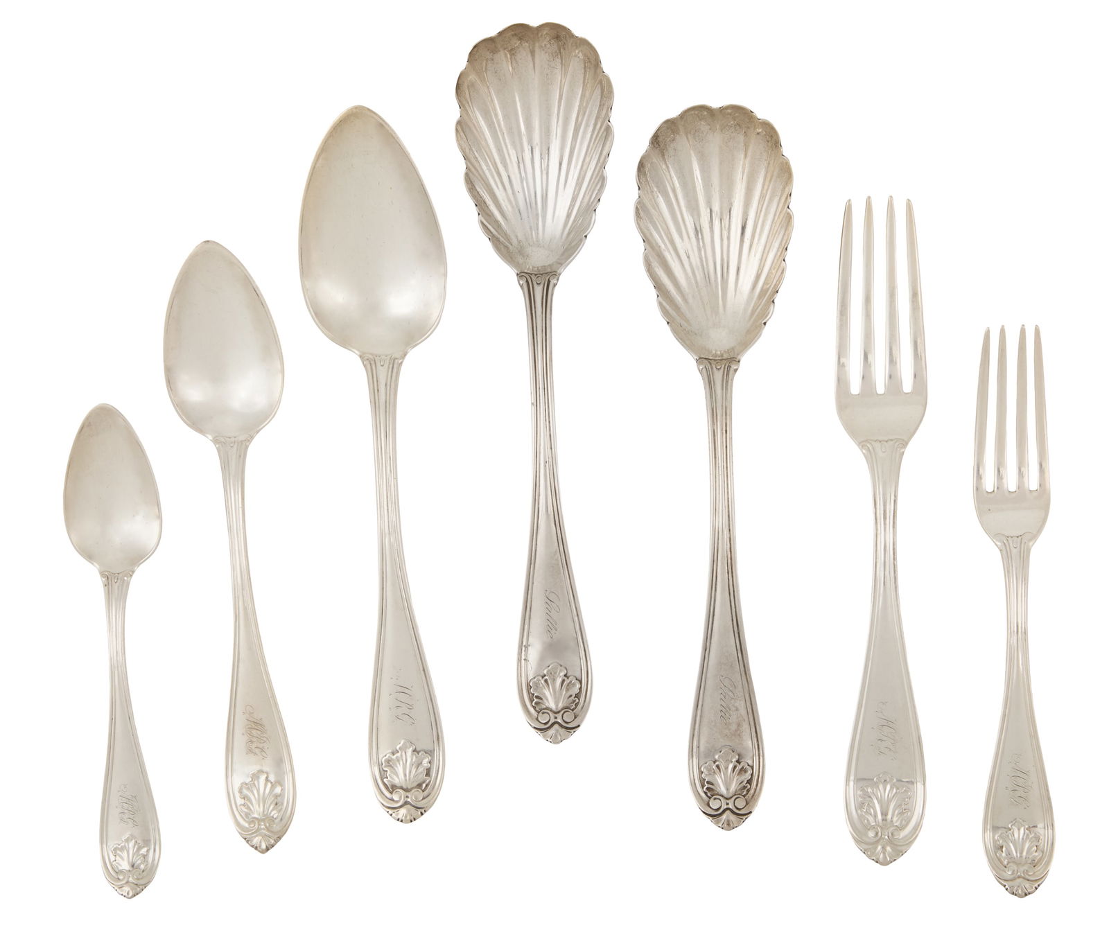Set of "Leaf & Shell" Coin Silver Flatware