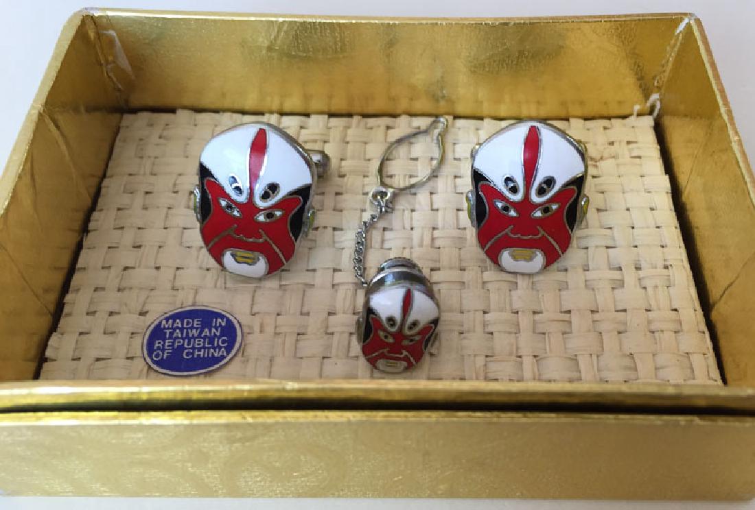 SET: Silver tone multi color enamel SAMURAI FACE shaped